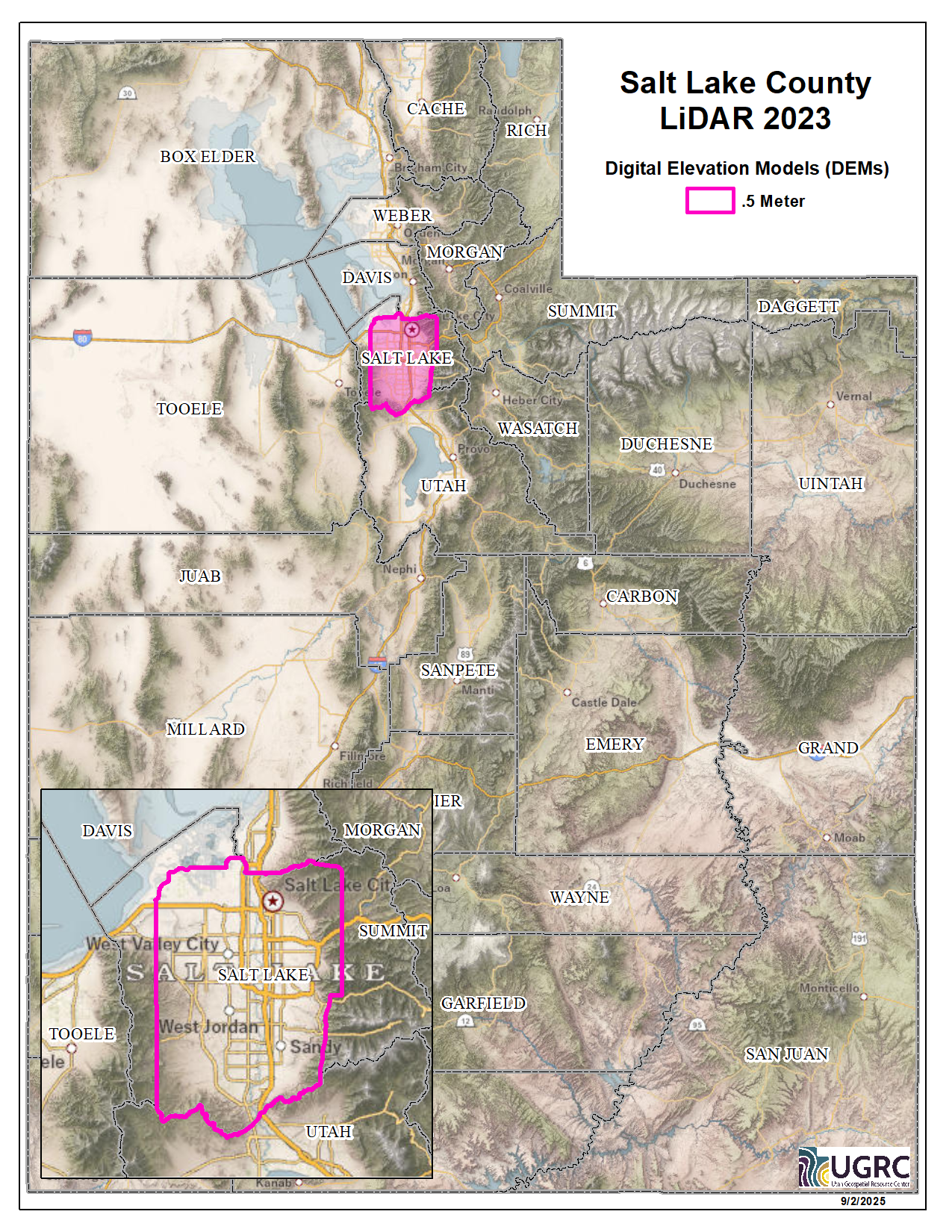 During 2023 the Utah Division of Emergency Management acquired ~493 square miles of 8 points per meter Quality Level 1 Lidar of the Salt Lake County valley floor. The 0.5 resolution bare earth DEMs and first-return/highest-hit DSMs in .tif format have a 10.0cm vertical RMSE accuracy and are available for download. This elevation data was collected between October 7th and November 5th of 2023.
