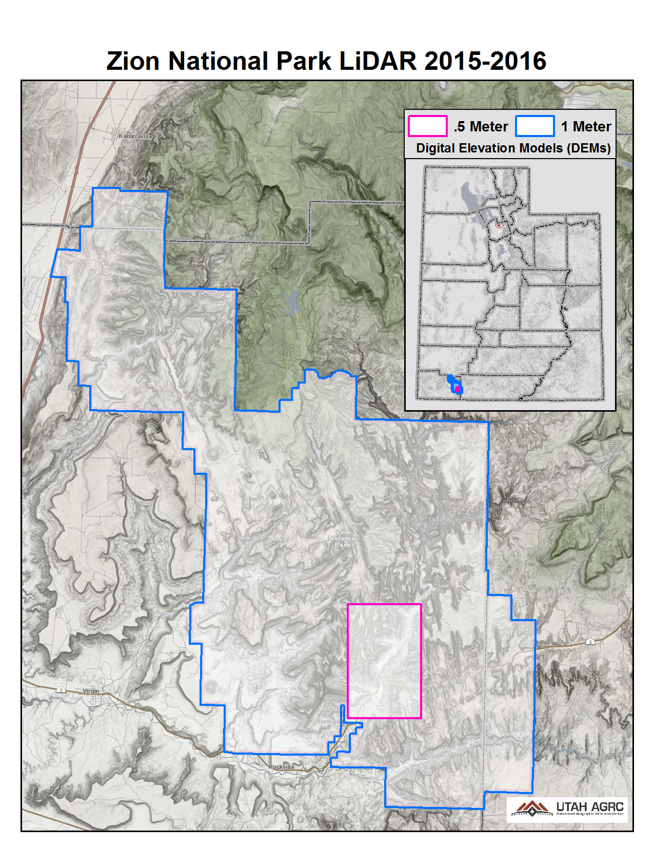 During 2015 and 2016 the U.S. Geological Survey and the U.S. Park Service acquired ~239 square miles of 2 and 8 points per meter Quality Level 1 & 2 Lidar for Zion National Park in Utah. The 0.5 and 1 meter resolution bare earth DEMs in .img format have a 10.0cm vertical RMSE accuracy and are available for download. The LAS point clouds, classified to ground, low, medium, and high vegetation, are available from The National Map , opens in a new tab . This elevation data was collected between November 2015 and July 2016