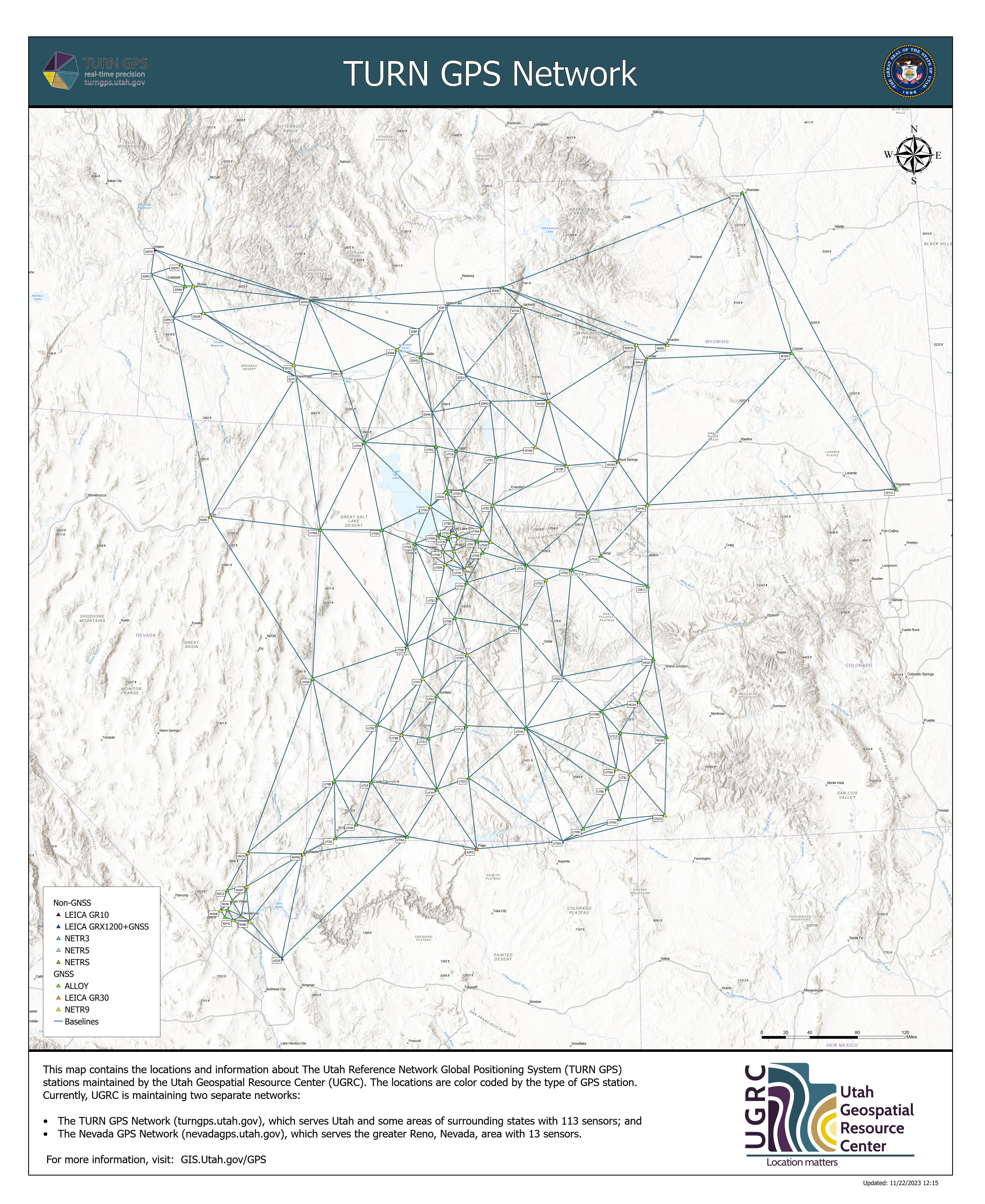 The Utah Reference Network (TURN) is a high-precision global navigation satellite system (GNSS) reference network providing real-time corrections and data for post processing. Our network consists of permanently located GPS receivers installed across Utah and portions of Idaho, Wyoming, and southern Nevada that generate real-time, high-accuracy GNSS positioning. These receivers send their data using the Networked Transport of RTCM via Internet Protocol (NTRIP) to a central system that analyzes the input to adjust and correct the data to provide the most accurate locations, usually down to centimeter level. Our network uses the Trimble Pivot VRS Platform.